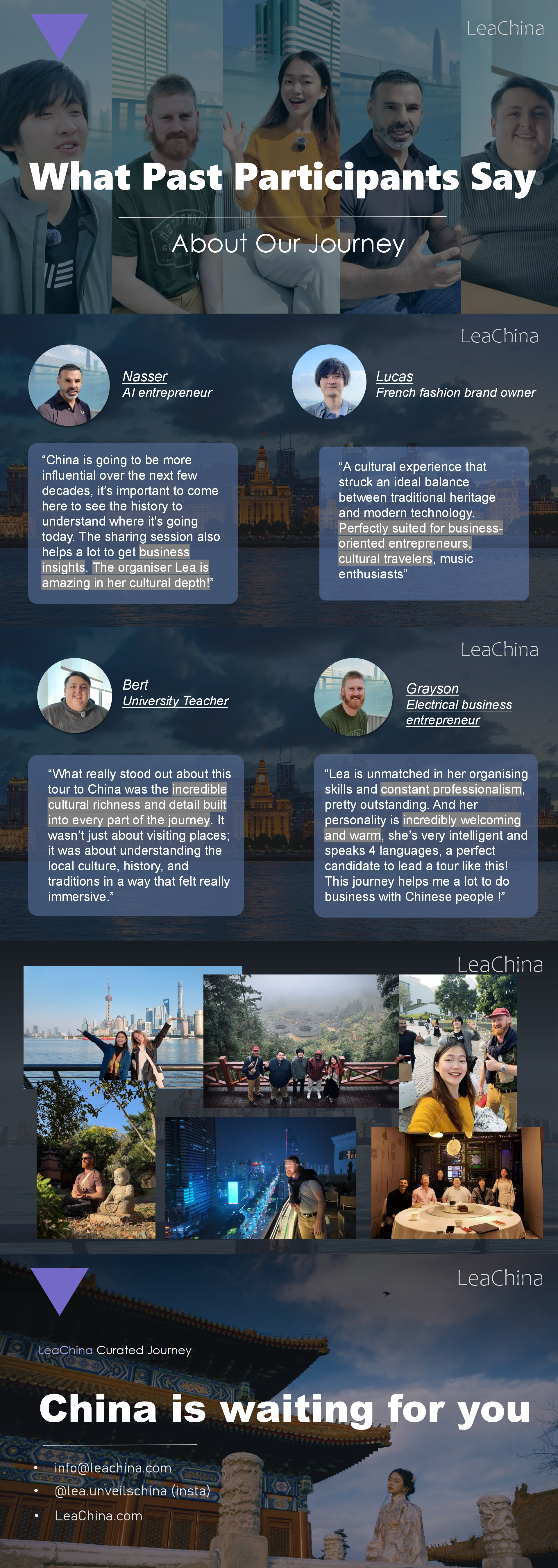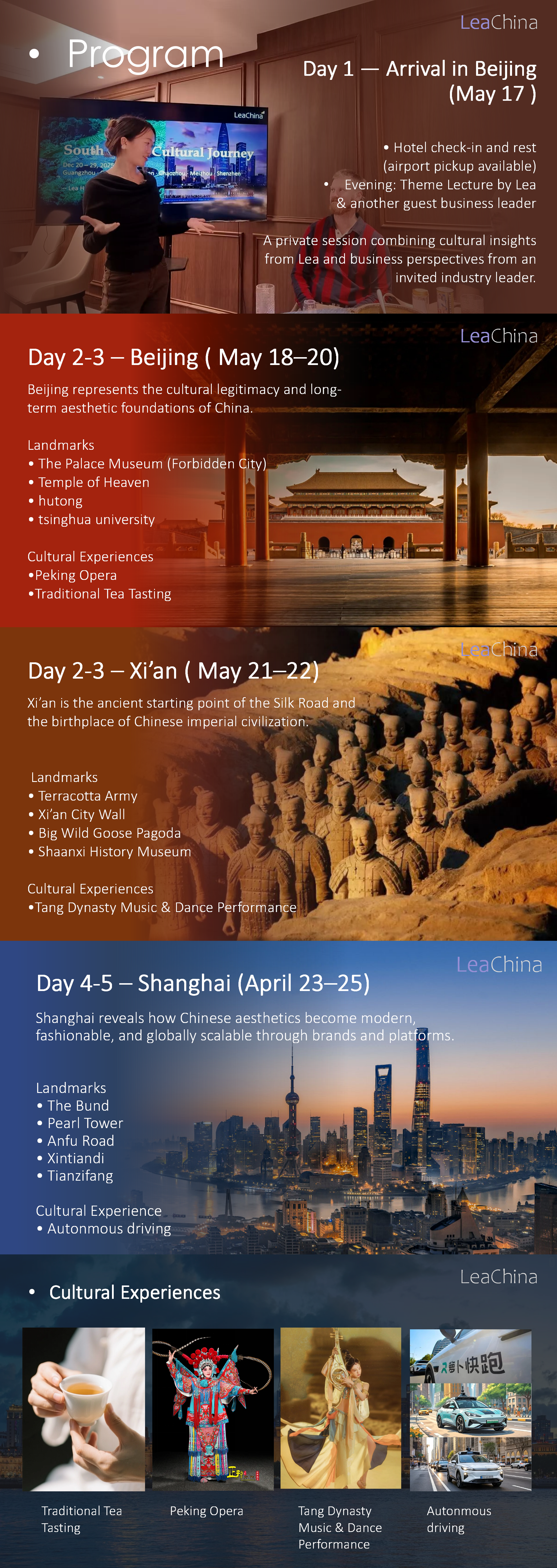 Led by Lea, a globally recognized quadrilingual cultural communicator, this program is guided by deep cross-cultural insight and first-hand global experience. Participants consistently highlight not only the intellectual depth of the program, but also Lea’s clarity, energy, and rare ability to translate China across cultures.
